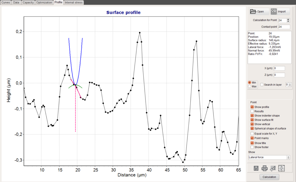 The local radius of the surface section is calculated and an effective radius is derived. The surface slope determines the force components in normal and lateral direction and both components together with the effective radius are used to derive the local stress and strain fields. For sharper roughness peaks and bigger sphere radius the contact point can deviate from the calculation point. This is considered in the calculation. The profile page shows all contact details and the stress or strain results.